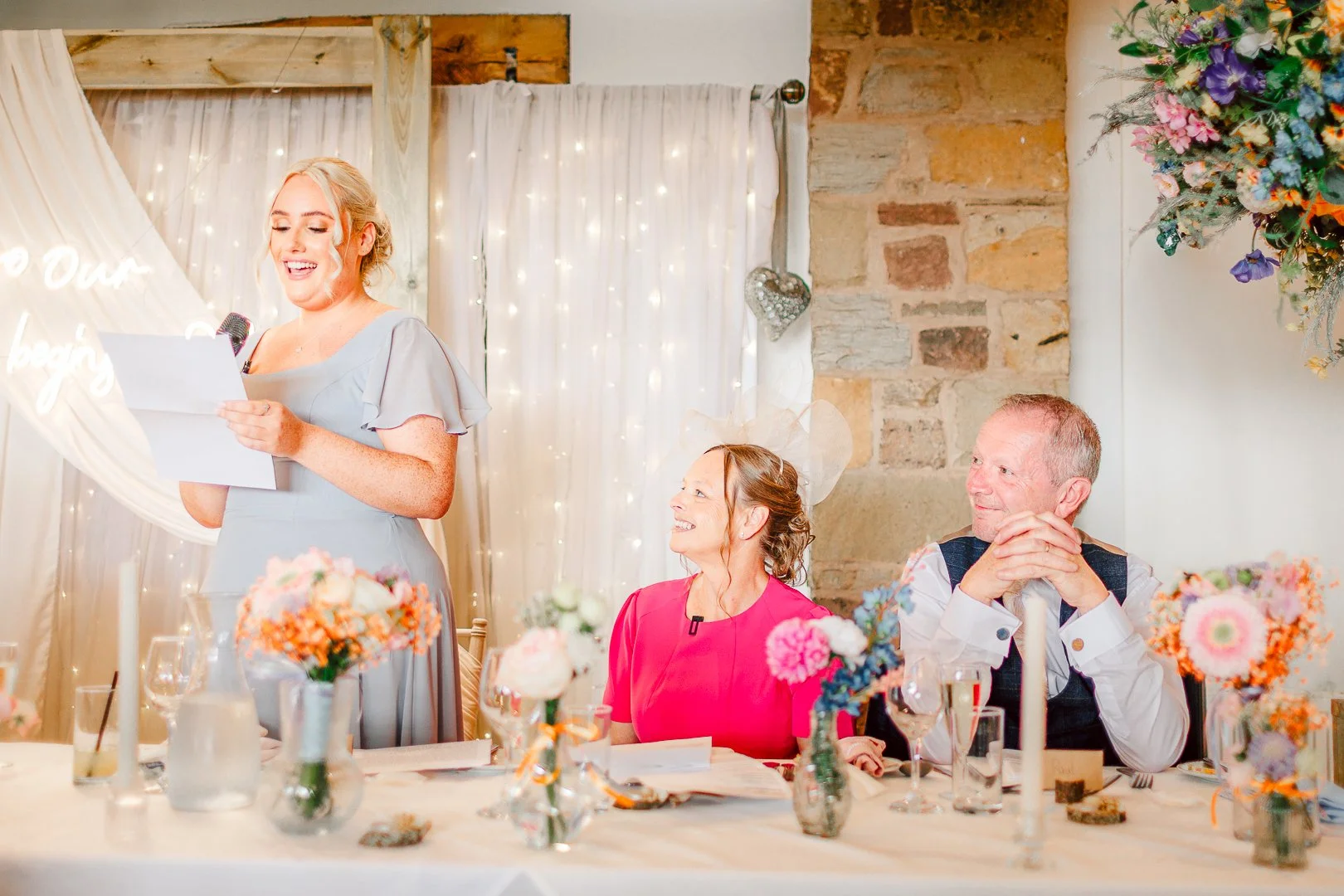 Maid of Honour Emily shares a look of joy with Mia during the speeches