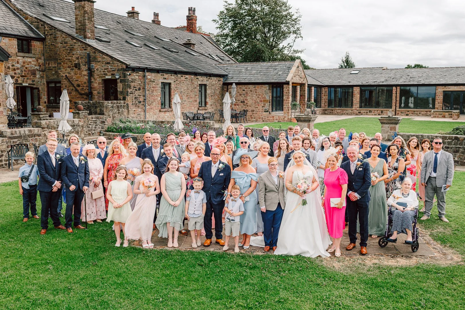 Everyone together. A full group shot of the ceremony guests in Beeston Manor’s beautiful gardens.