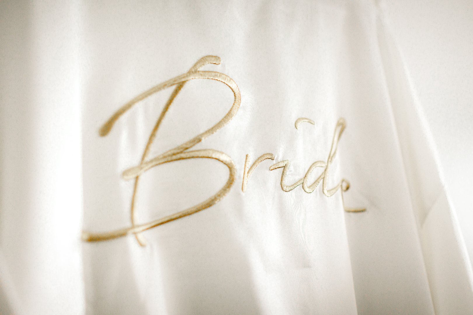 A delicate white dressing gown embossed in gold with 'Bride', the perfect attire to wear before the wedding day unfolds.