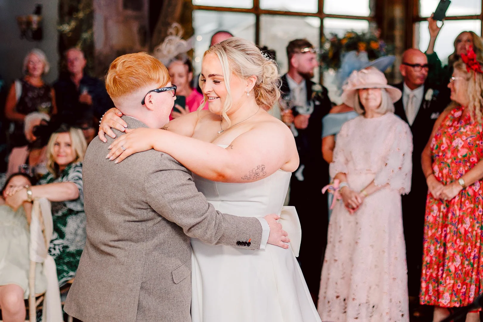 The wedding cake itself was a real showstopper. A beautiful floral design from base to top, with a fun twist: two little fondant dogs playfully biting into the cake, a loving tribute to the couple’s much-missed pups who couldn’t be there on the day. Before the cake was cut, the couple made a speech to the now packed out room, sharing their journey of the past 12 months leading up to this day. Another moment filled with tears of joy and smiles of happiness from everyone.