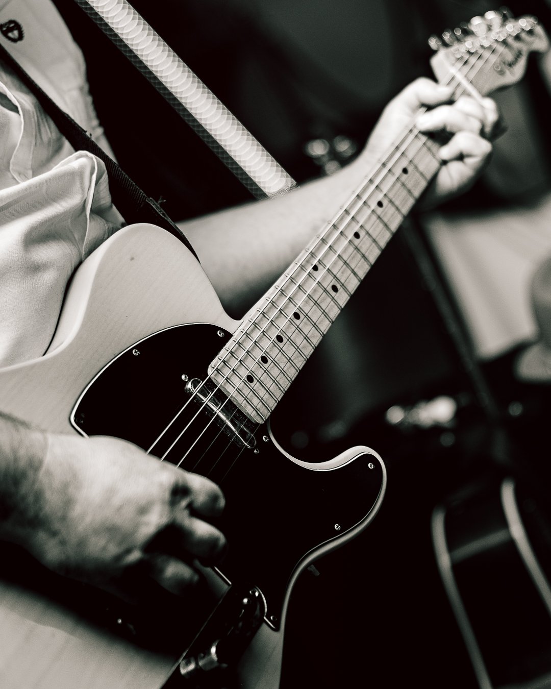 A monochrome shot of the live guitarist who added timeless style to the wedding soundtrack.