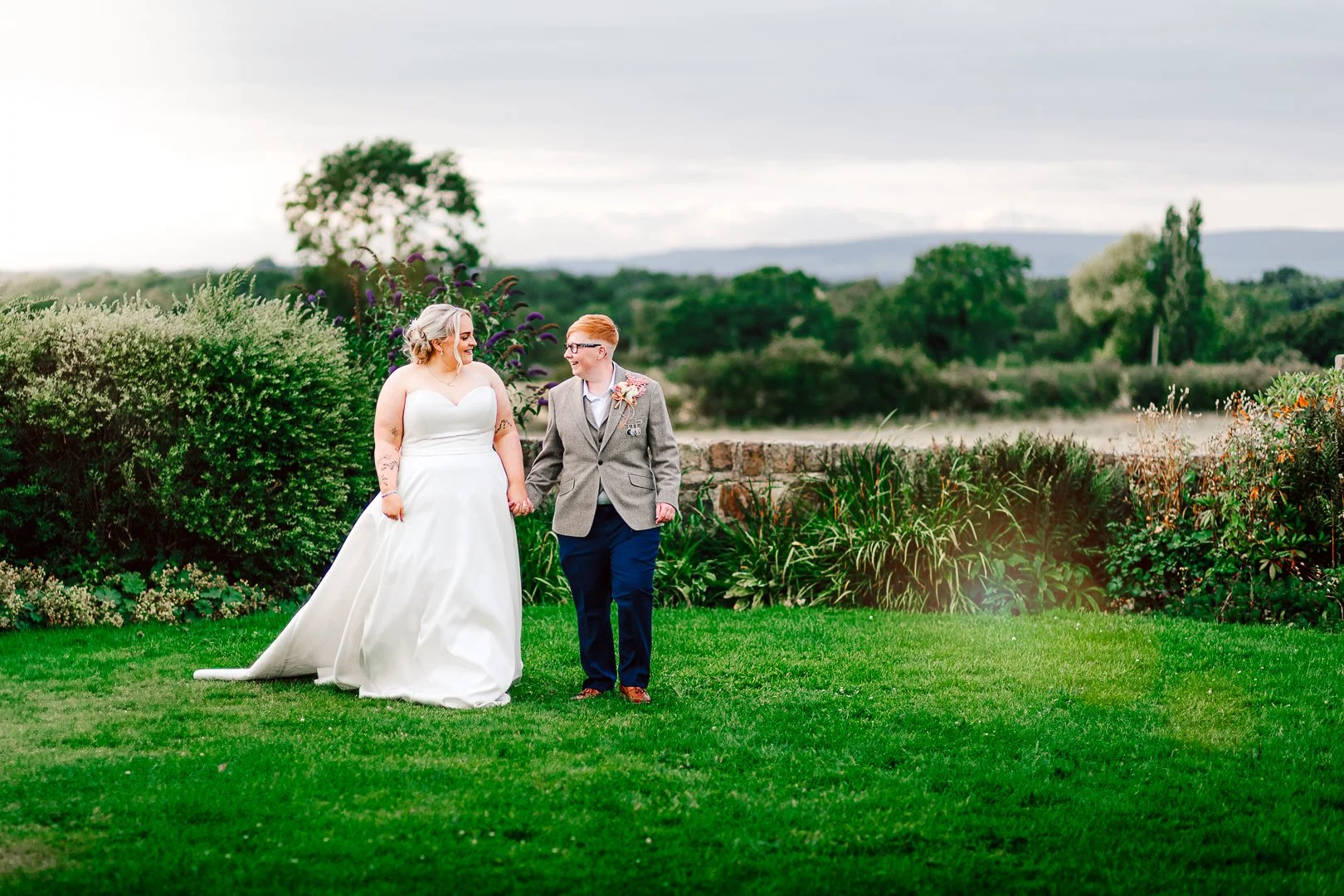 Mia and Bec walk through the gardens of Beeston Manor hand-in-hand, newly married and full of joy.