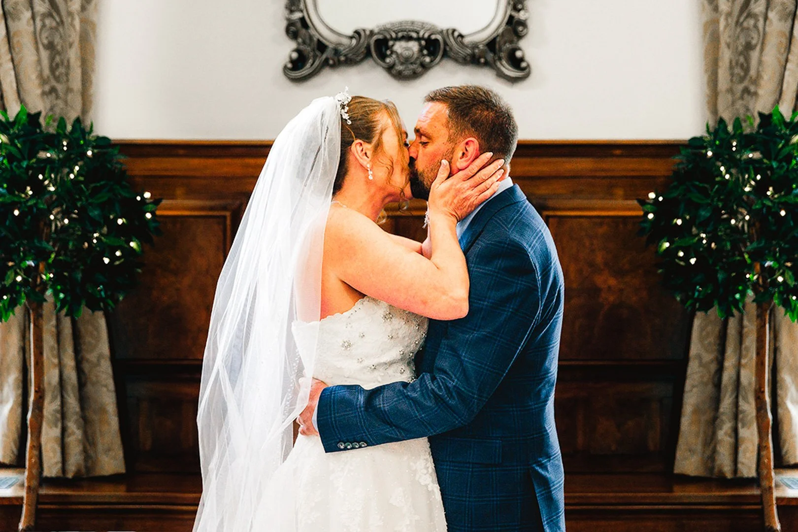 Rachel and Matthew sharing their ‘first kiss’ at the front of the ceremony room at Sale Town Hall